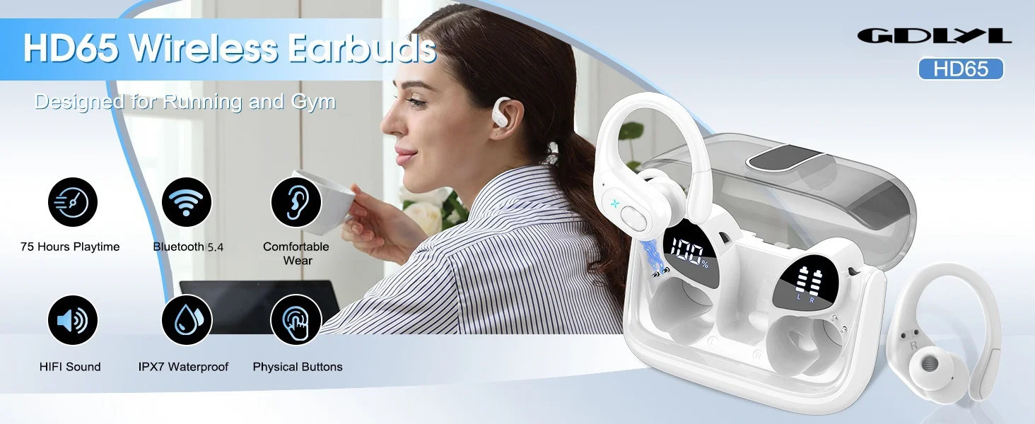 The wireless earphones in ear running includes three clickable buttons for playing or pausing music, controlling volume, activating Siri and accepting or rejecting calls. In addition, designed with IPX7 technology, making the HD65 black sports earhooks waterproof and sweatproof. Enjoy great performance in a variety of environments, from the daily training to outside sporting.