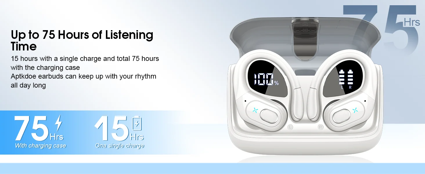 The wireless earbuds provides up to 15H continuous using time on a single charge, plus a total of 75H of use with the 650mAh charging case. The charging case can be fully charged in just 1.5H via USB-C charging. Whether you're running, gaming or working, you don't have to worry about powering up your bluetooth earbuds - go up to a week without recharging with the HD65 earbuds wireless bluetooth.