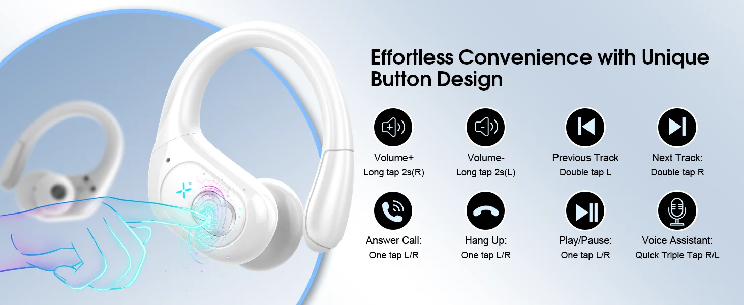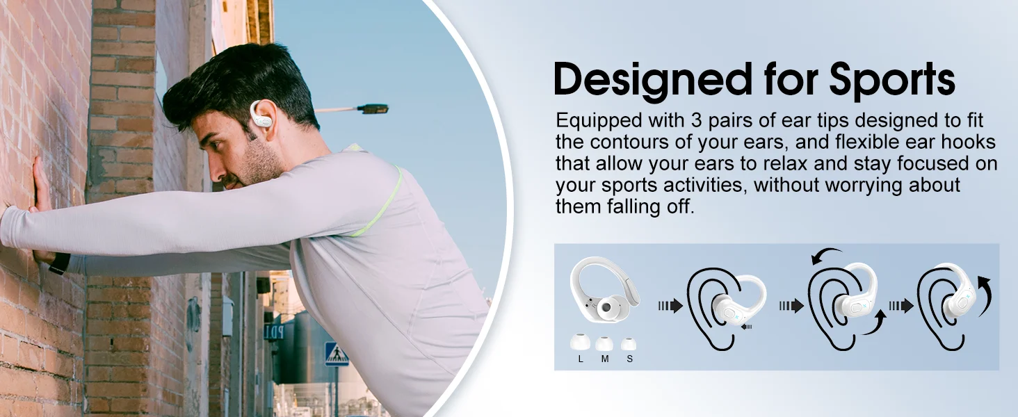 The running headphones features ear hooks made of an innovative TPE (elastic) material that not only solves the problem of wireless earphones falling off when running, but is also comfortable to wear and anti-allergic. The bluetooth headphones over ear is available with three sizes of high-quality silicone eartips (S/M/L), offering a breathable and lightweight fit for you to choose from.
