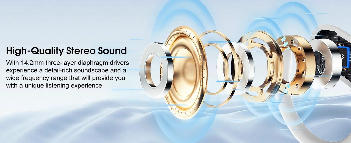 The headphones bluetooth wireless has a built-in 14.2mm dynamic driver with a separate sound chamber design that delivers powerful 3D bass quality and a dynamic listening experience to power your workout. It is also paired with 4 CVC8.0 HD micrs with ENC reverse wave speed shaping technology to effectively reduce noise interference during calls.